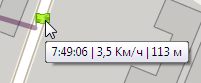| Точка снятия GPS-активности, показывающая точку окончания движения по маршруту транспортного средства мобильного сотрудника, при наведении курсора показывается информация о времени снятия GPS-активности, средней скорости в точке снятия GPS-активности, расстоянии, пройденном с начала движения по маршруту. |