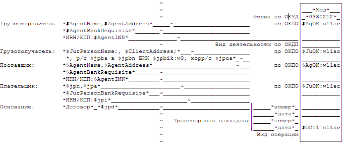 Ниже рассмотрен пример задания директив для шаблона печатной формы Торг-12. Комментарии в примере обозначены символом "//"). Пример формы, открытой в системе, представлен на Рис 195, «Шаблон Торг-12».